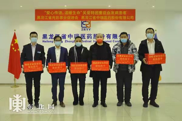2022年1月21日,黑龙江省中瑞医药股份有限公司向黑龙江省光彩事业促进会捐赠特困重症血友病患者急需的紧缺救命药,保障他们生命安全。