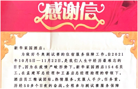 新华家园酒店(新华家园健康科技(北京)有限公司)位于赛事核心区延庆区,服务保障工作十分繁重。冬奥会筹办和比赛期间,酒店牢牢把握“简约、安全、精彩”的办赛要求,特别是妥善应对疫情带来的各种冲击挑战,切实增强责任感、使命感和紧迫感,坚决克服各种困难。