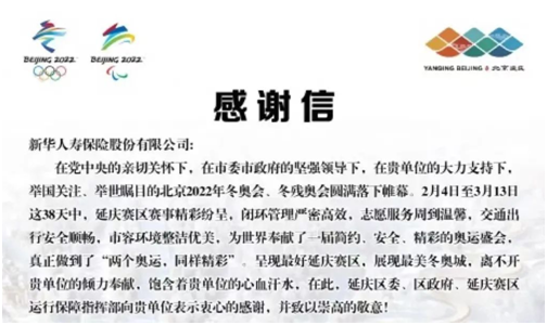 4月19日,北京冬奥会冬残奥会北京市·北京冬奥组委总结表彰大会在京召开,授予500个集体“北京2022年冬奥会、冬残奥会北京市先进集体”称号。新华保险的全资子公司——新华家园健康科技(北京)有限公司(新华家园酒店),因在北京冬奥会测试赛、冬奥会、冬残奥会的优秀接待服务荣膺“先进集体”。