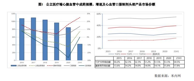 据行业数据平台米内网显示,尽管公立医疗端心脑血管疾病中成药市场规模自2018年以来呈下降趋势,但内部结构性影响不容忽视。中成药口服制剂市场份额由2015年的34.8%增至2021上半年的57.5%,逐步占据领先地位。其中,中成药心血管口服制剂TOP10产品市场份额由2015年的50.2%提升至2021上半年的54.5%,市场集中度亦在稳步提升。