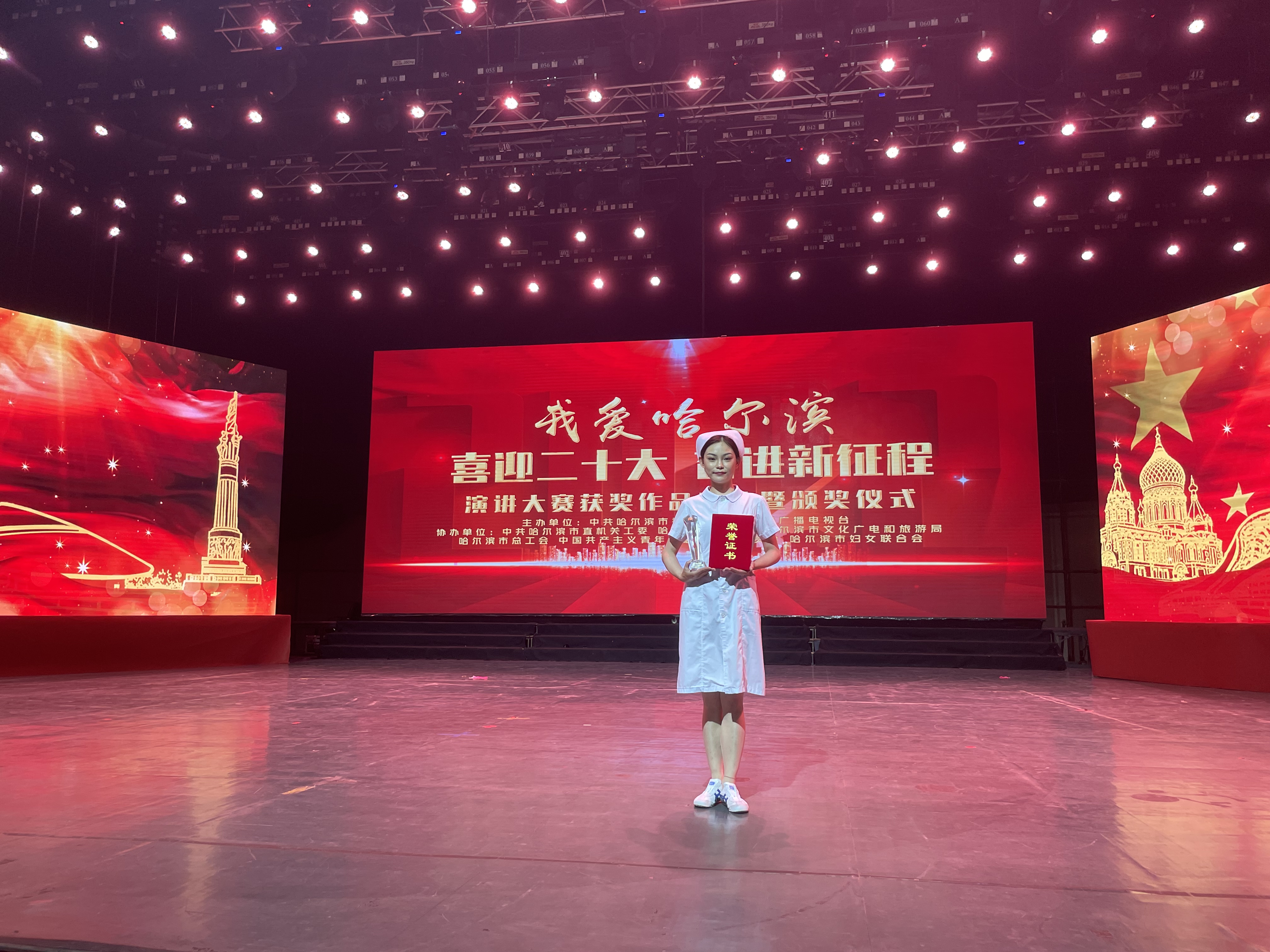 6月24日,由中共哈尔滨市委宣传部、哈尔滨广播电视台主办的“我爱哈尔滨·庆祝二十大 奋进新征程”演讲大赛获奖作品展演暨颁奖仪式在哈尔滨广播电视台千米演播大厅举行,哈尔滨市红十字中心医院妇三科护士刘慧超荣获大赛三等奖。