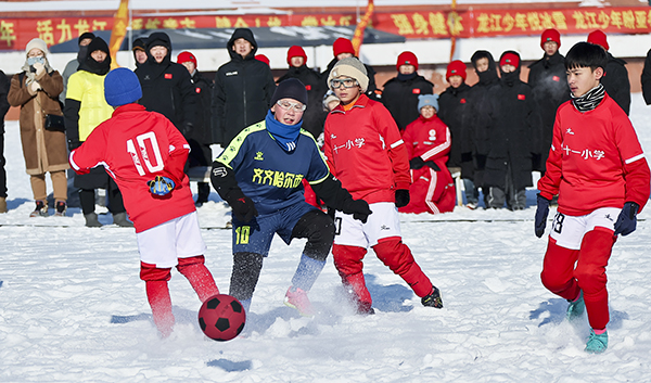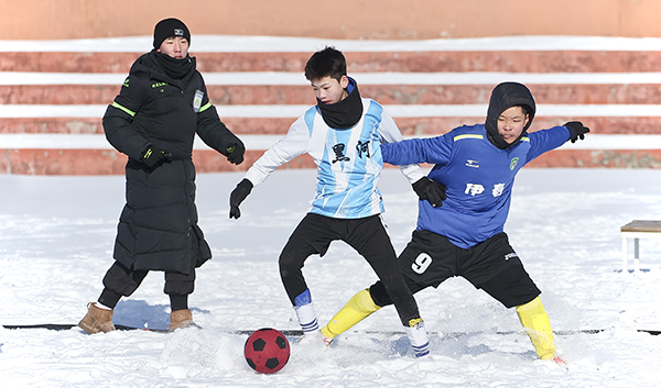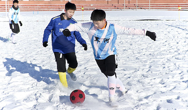 “雪地足球和平时踢球感觉完全不一样。传球的力量要更大,因为球在雪地里不易滚动,所以带球也更消耗体力。五人制比赛也需要有更大的跑动范围,我是前锋也要在场上就来回跑位、拼抢。因为不停地跑,所以我在场上一点也不感觉冷。”方炫烨说。