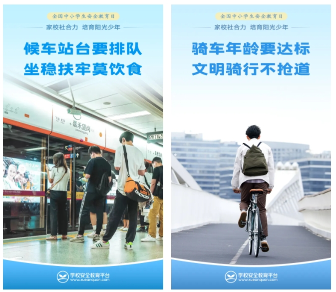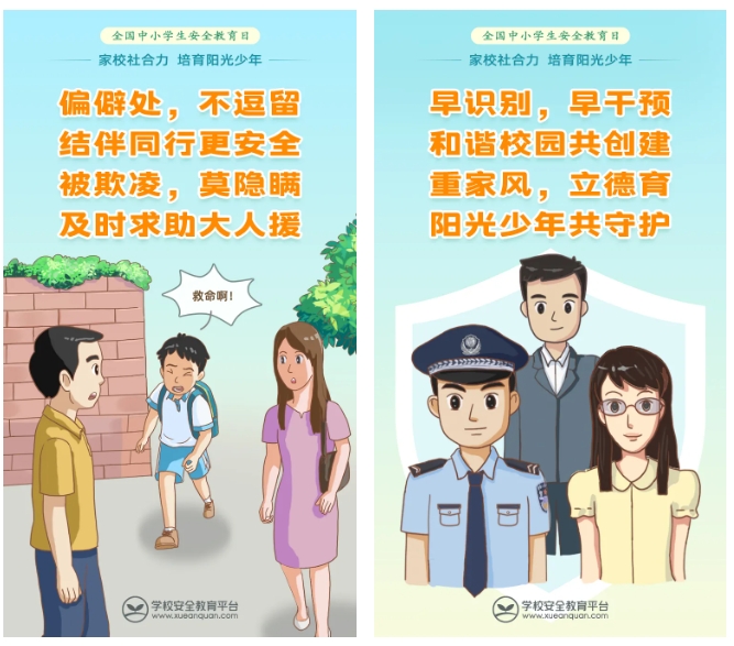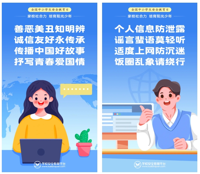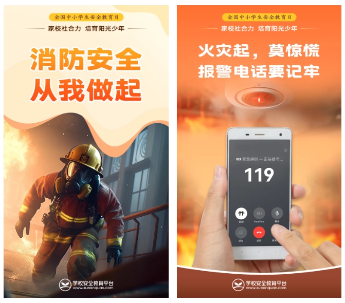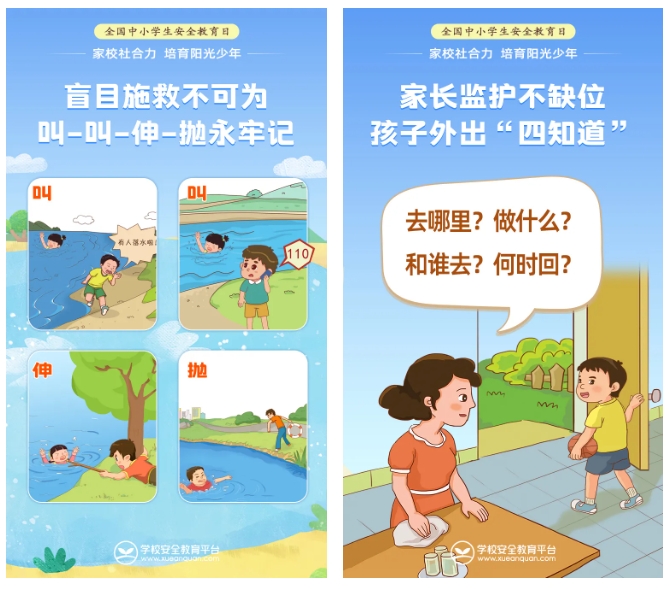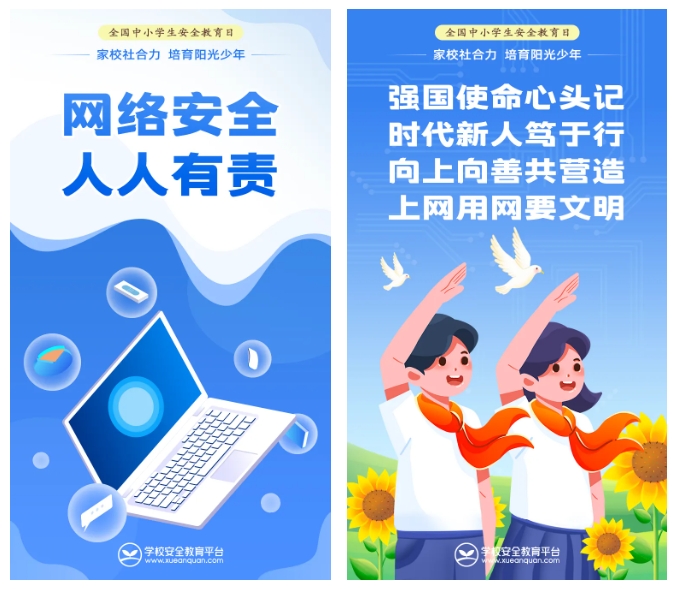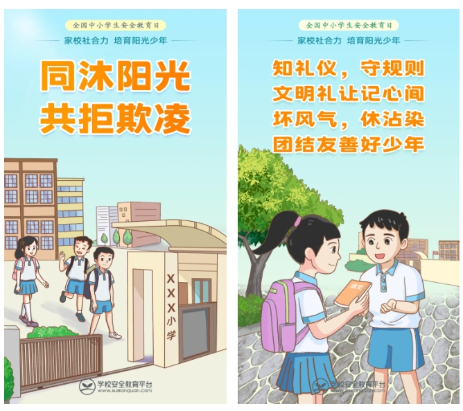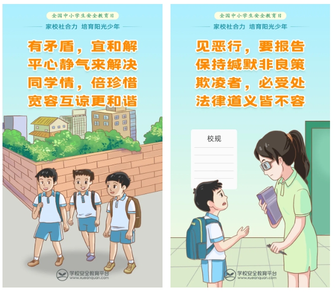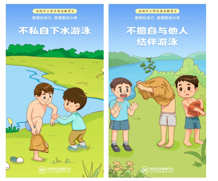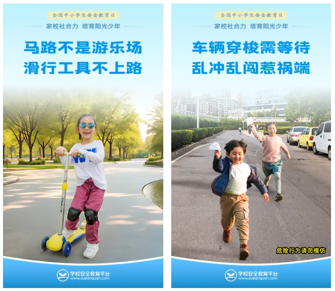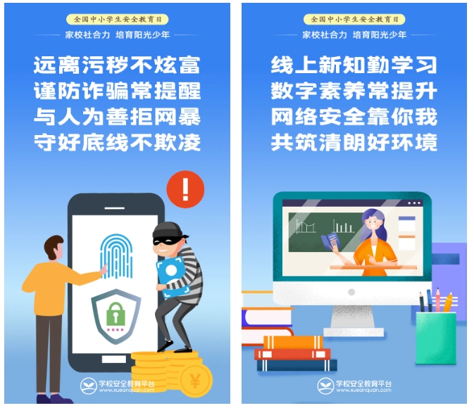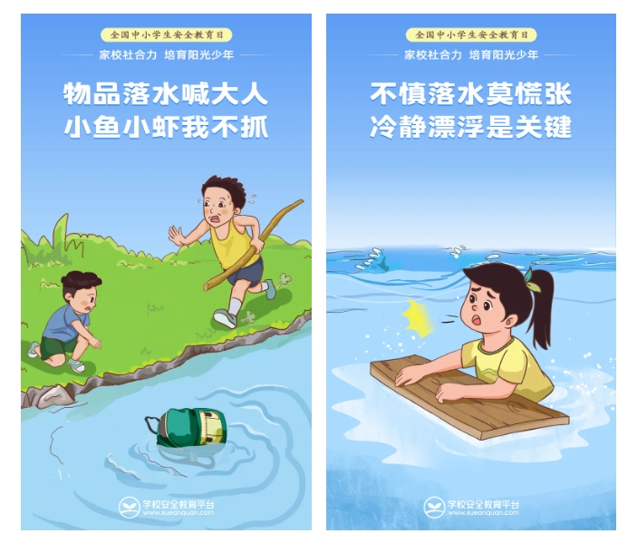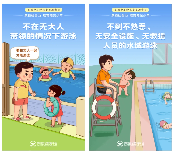 为切实提升中小学生安全素养,杜绝各类危险事故的发生,在全国中小学生安全教育日来临之际,学校安全教育平台精心准备了预防溺水、防学生欺凌、网络安全、交通安全和消防安全5个主题的安全海报,守护孩子安全成长。