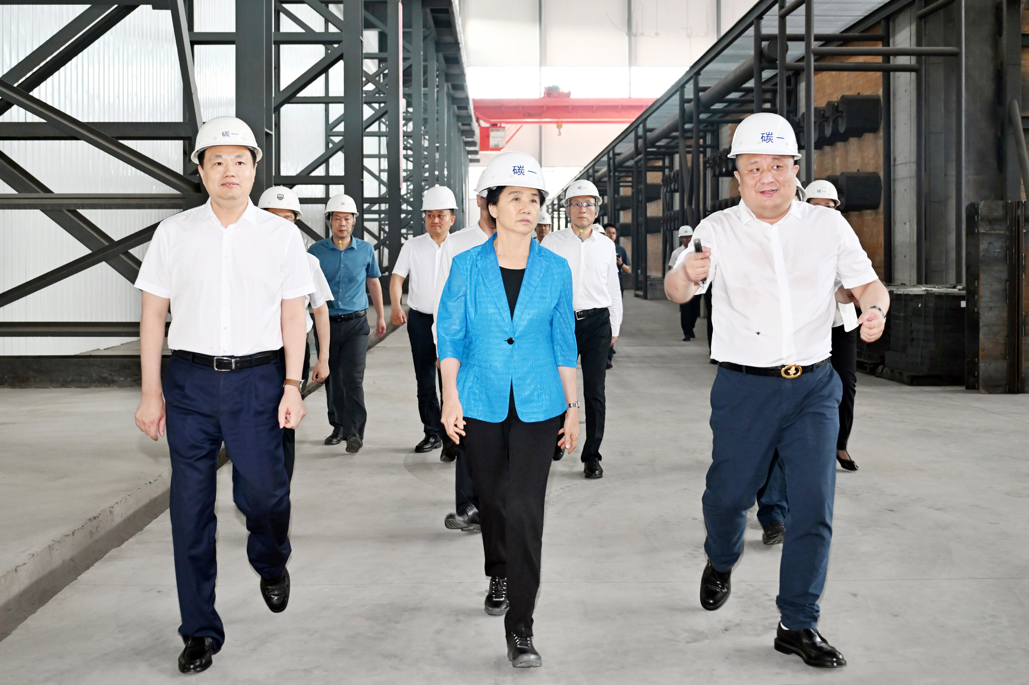 ▲省委副书记、省长梁惠玲来到宝山区碳一锂电池人造负极材料项目建设现场,了解项目建设进展情况。